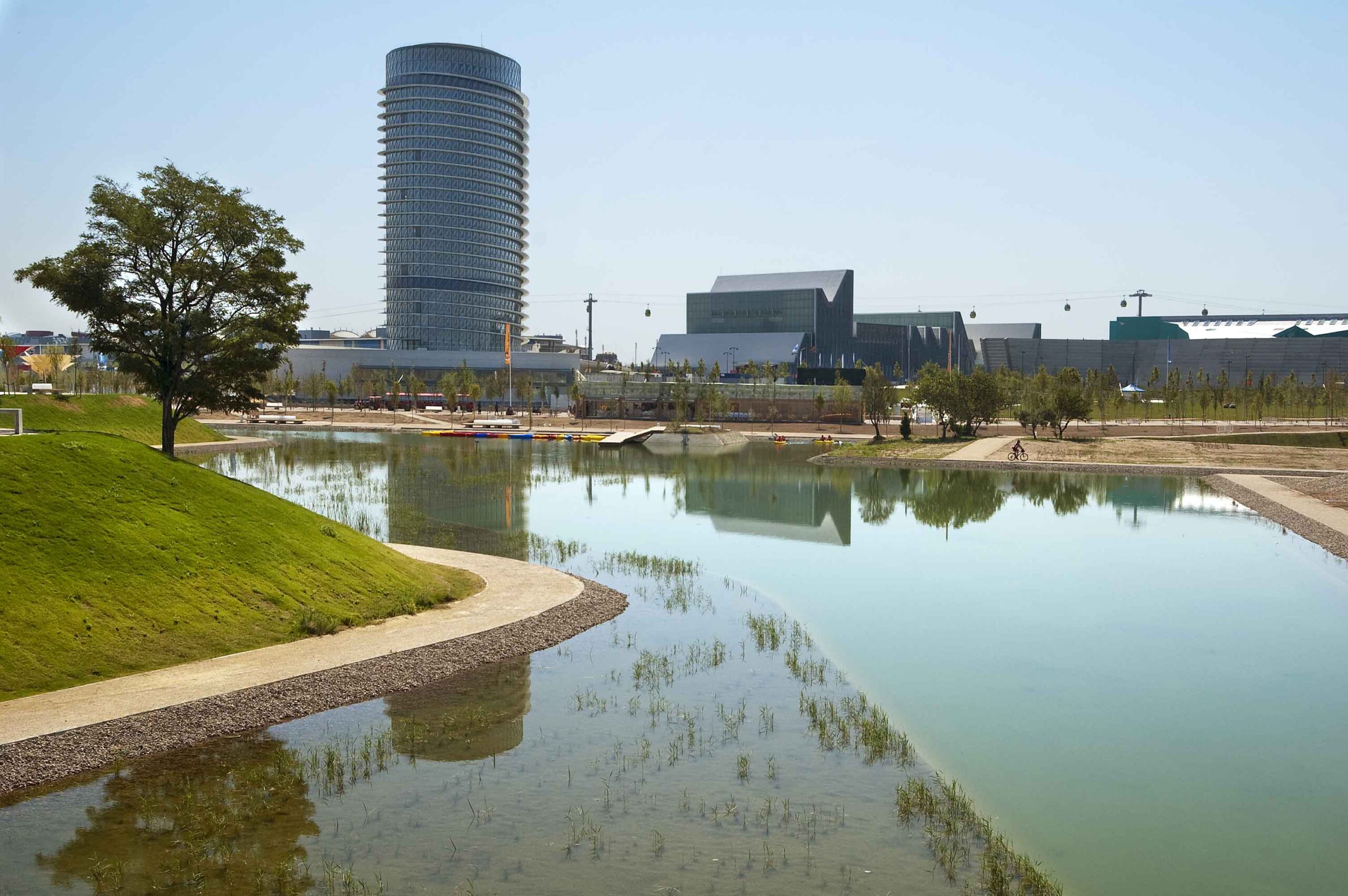Zaragoza. Laguna del parque del agua “Luis Buñuel”, al fondo la torre del agua y el palacio de congresos